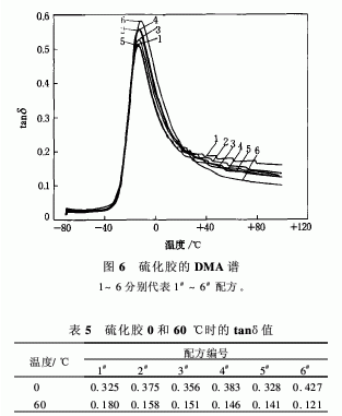 硫化膠的DMA譜如圖6所示,0和60℃時的tanδ值如表5所示。從圖6和表5可以看出,白炭黑部分和完全替代炭黑后,硫化膠的玻璃化溫度向高溫方向偏移,0℃時的tanδ值增大,60℃時的tanδ值減小,且白炭黑用量越大,60℃時的tanδ值越小,這與滾動損失變化趨勢吻合。這表明,白炭黑部分和完全替代炭黑后,硫化膠的抗?jié)窕蕴岣?滾動阻力減小。