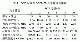 POE的分子鏈?zhǔn)秋柡偷?所以需要用過(guò)氧化物或輻射交聯(lián),本工作選過(guò)氧化二異丙苯(DCP)作交聯(lián)劑,考察其用量對(duì)POE力學(xué)性能的影響,如表1所示。