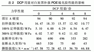 由上面的實(shí)驗(yàn)可以看出,要提高交聯(lián)POE的力學(xué)性能,只加入DCP力學(xué)性能滿足不了用戶要求,必須對(duì)材料進(jìn)行補(bǔ)強(qiáng)。這里采用白炭黑作為補(bǔ)強(qiáng)劑,為了得到補(bǔ)強(qiáng)體系中DCP的最佳用量,在配方中把DCP含量作為變量,填充40份白炭黑進(jìn)行補(bǔ)強(qiáng)。