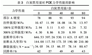 (2)白炭黑對(duì)POE硫化膠具有非常好的補(bǔ)強(qiáng)效果,其用量20份以上較佳。