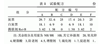 NR, SIR20,印度尼西亞產品; BR,牌號9000,中國石化北京燕山石油化工股份有限公司產品;白炭黑,牌號175GR,羅地亞白炭黑(青島)有限公司產品;硅烷偶聯(lián)劑Rsi-B,南京曙光化工總廠產品;其它均為橡膠工業(yè)常用原材料。