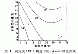 從圖1可以看出,隨著炭黑和白炭黑用量增大,焦燒時間呈縮短的趨勢。從圖2可以看出,隨著炭黑用量增大,正硫化時間呈縮短的趨勢;隨著白炭黑用量增大,正硫化時間呈延長趨勢。