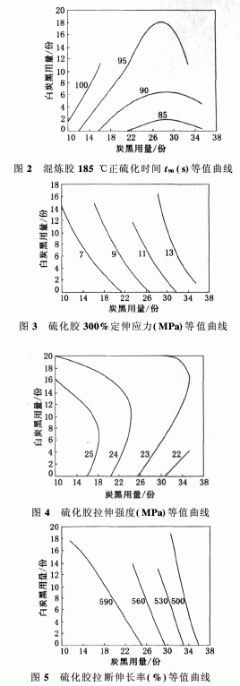 采用旋轉設計二次回歸法,選擇炭黑和白炭黑用量作為相關因子,對炭黑和白炭黑用量進行回歸分析并做出性能等值曲線圖。小配合試驗配方如表1所示。