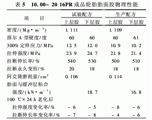 從表5可以看出,與生產配方相比,試驗配方胎面膠的300%定伸應力、拉伸強度和扯斷伸長率較高,胎面與緩沖層粘合性能較好,其它性能相當。