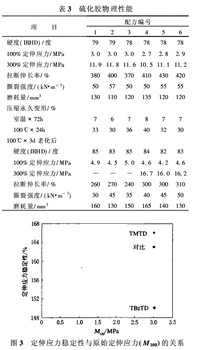在170℃下硫化至t95的硫化膠性能示于表3。老化試驗(yàn)和使用條件下獲得的結(jié)果表明,使用TBzTD減小了硬度變化。含TBzTD膠料的硬度變化為4度,而對(duì)比膠料和含TMTD膠料(膠料1和3)的硬度變化分別為6和7度。這些變化在定伸應(yīng)力變化或定伸應(yīng)力穩(wěn)定性數(shù)據(jù)中也得到了反映(見(jiàn)圖3)。