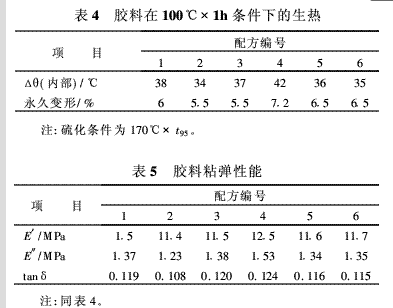 表4示出了膠料的生熱數(shù)據(jù)。令人矚目的是TMTD對(duì)生熱性沒(méi)有任何作用,而TBzTD在所有體系,包括TESPT減量體系(膠料2,5和6)中均有積極作用。這一結(jié)果證實(shí)了TMTD未以尋常方式參與到硅烷/白炭黑體系中。當(dāng)對(duì)比粘彈性能時(shí)(見(jiàn)表5),就可以更加明了其詳細(xì)情況。TMTD對(duì)滯后性能幾乎沒(méi)有影響,而TBzTD對(duì)tanδ以及滾動(dòng)阻力有積極作用。
