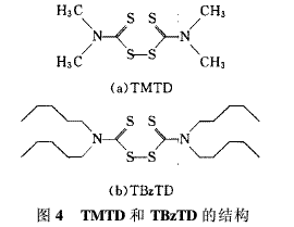 從結(jié)構(gòu)看,TMTD和TBzTD的差異在于它們是胺不同的衍生物(見(jiàn)圖4)。