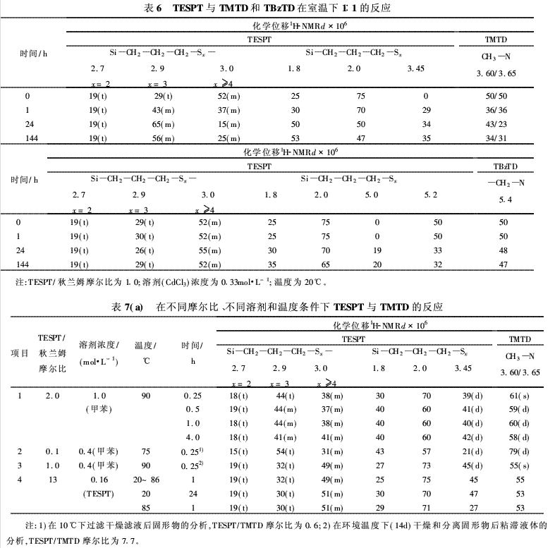 用1H-NMR研究了純凈TESPT與TBzTD或TMTD之間以及在以氯仿或二氯乙烷為溶劑時(shí)它們之間的化學(xué)機(jī)理。在膠料配方中TESPT與秋蘭姆的質(zhì)量比為32∶1(分別為6.4和0.2份),與TBzTD的摩爾比為29∶1,與TMTD的摩爾比為13∶1。這些比例對(duì)說(shuō)明化學(xué)機(jī)理沒(méi)有那么重要,因此,為了便于分析,在研究中采用了不同的比例。第1系列試驗(yàn)在環(huán)境溫度的氯仿中以1∶1摩爾比進(jìn)行。制備了清澈的溶液并及時(shí)進(jìn)行了測(cè)定。如表6所示,TESPT的1H-NMR譜表明,2.0×10-6處的中間CH2基團(tuán)移至1.8×10-6,與硫相鄰的CH2基團(tuán)對(duì)2.7×10-6(S2)處的信號(hào)沒(méi)有影響;2.9×10-6(S3)的信號(hào)增強(qiáng),3.0×10-6(x>3)的信號(hào)減弱。
