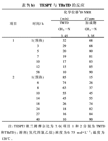 用NMR120℃高溫探頭進(jìn)行最后的1H-NMR試驗(yàn)。制備了TESPT/秋蘭姆(7∶1)的混合液,用25%的二氯乙烷稀釋。在室溫下,兩種秋蘭姆均不溶于混合液。將NMR管置入已達(dá)到120℃的NMR探頭里,然后立即進(jìn)行測(cè)量。有趣的是看到TMTD中兩個(gè)甲基的信號(hào)和TBzTD中兩個(gè)亞甲基的信號(hào),由于在C( S) N鍵周圍的活動(dòng)受到限制,在室溫下它們顯示出兩個(gè)峰,而在120℃下變成了一個(gè)峰。因此,測(cè)量轉(zhuǎn)化率就容易多了。在TMTD試驗(yàn)中,3.38×10-6處CH3的吸收減弱,而3.45×10-6處加成物的吸收增強(qiáng)。在與TMTD的反應(yīng)中,12min后的轉(zhuǎn)化率達(dá)到90%。TBzTD中芐基的吸收峰在5.05×10-6,而加成物的吸收峰在5.15×10-6處。假設(shè)反應(yīng)為一級(jí)反應(yīng),計(jì)算120℃下反應(yīng)速度。顯然,TBzTD的反應(yīng)速度比TMTD慢得多。因此可以推斷,TMTD在硫化條件下不再有效,因?yàn)槠浯蟛糠忠雅cTESPT反應(yīng)而被消耗掉,從而失去了促進(jìn)作用。另一方面,TBzTD與TESPT的反應(yīng)速度慢,其大部分保留了下來(lái),而且可在硫化中起促進(jìn)作用,從而提高了硫化速度。