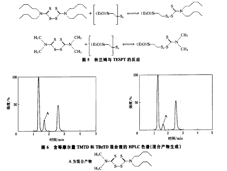 在填充炭黑的膠料中,TMTD和TBzTD起輔助促進(jìn)劑的作用,而在白炭黑/硅烷膠料中它們的作用是不同的。為了降低反應(yīng)的復(fù)雜程度,采用簡(jiǎn)單的含這兩種秋蘭姆和TEPST的體系研究其在化學(xué)方面的差異,認(rèn)為白炭黑對(duì)秋蘭姆化學(xué)反應(yīng)活性的影響是次要的。