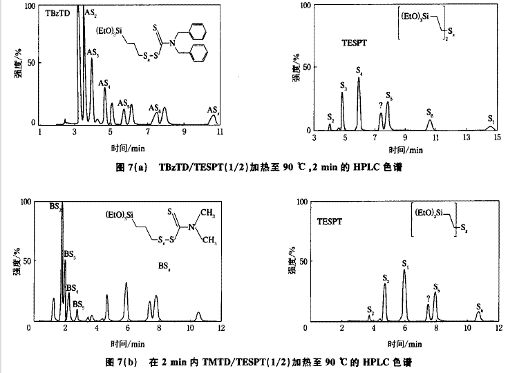 TESPT和TMTD/TBzTD ( 5∶1 )混合液在90℃下2 min后的HPLC圖譜表明,除了TBz-TD/TMTD和TESPT吸收峰以外,還有一系列新峰[見(jiàn)圖7(a)和(b)]。這些峰最有可能是含有不同原子數(shù)硫黃的(圖5,x=1~4)。試驗(yàn)結(jié)果還表明,TESPT與TMTD的反應(yīng)速度比與TBzTD的反應(yīng)速度要快得多。根據(jù)HPLC譜圖可以看出,TMTD減弱程度比TBzTD大。