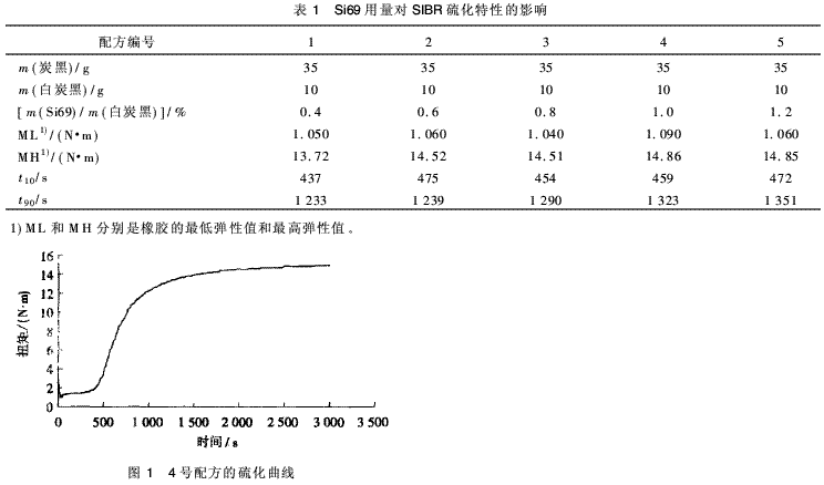(1)在以炭黑補(bǔ)強(qiáng)SIBR為主的膠料體系中,偶聯(lián)劑Si69具有延緩硫化時(shí)間的作用;Si69在SIBR膠料中的最佳用量為白炭黑用量的8%~10%。
