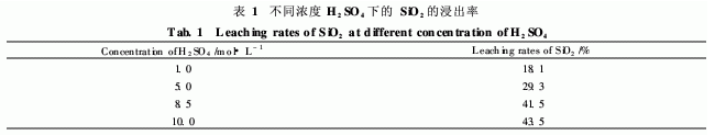 為了考查H2SO4濃度對SiO2浸出率的影響,本文分別采用了1. 0mol/L、5. 0mol/L和8. 5mol/LH2SO4的實(shí)驗(yàn)條件,其它條件為反應(yīng)時(shí)間6. 0h,反應(yīng)溫度90℃。實(shí)驗(yàn)結(jié)果如表1所示。