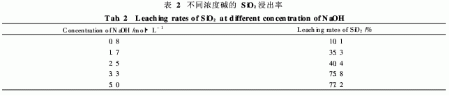 表2是采用不同濃度的NaOH溶液,反應(yīng)溫度為100℃、反應(yīng)時(shí)間為4. 0h的實(shí)驗(yàn)條件下得出的SiO2浸出率結(jié)果。