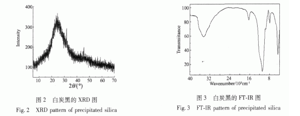 (4)堿離解法制備的白炭黑產(chǎn)品中, SiO2的純度為91. 8%,比表面積(BET法)為114m2/g,并經(jīng)XRD、FT-IR、TEM確定其為完全無定型狀態(tài)的水合二氧化硅,所得產(chǎn)品符合HG/T 3061-1999的要求。