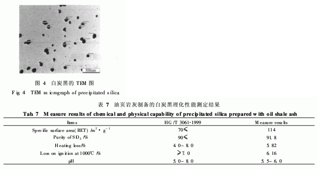 白炭黑的其他指標(biāo)為白度為98. 4,Al2O3含量為2. 67%,Fe3+含量為0. 66%。如表7所示,采用堿離解法從油頁巖灰制備白炭黑,所得產(chǎn)品符合行業(yè)標(biāo)準(zhǔn)HG/T 3061-1999的要求。