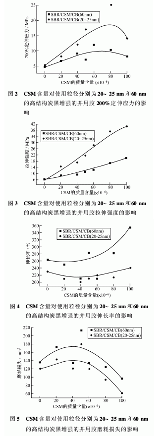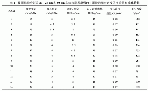 本文研究了機(jī)械混煉和硫化的14個(gè)不同的SBR/CSM配方。研究了其機(jī)械性能,如硬度、定伸應(yīng)力、拉伸強(qiáng)度和磨耗性。通過硫化測試研究了物理性能,詳細(xì)考察了工業(yè)上使用的兩種不同粒徑(20~25 nm及60 nm)高結(jié)構(gòu)炭黑與橡膠性能的關(guān)系。