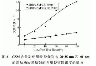 為了評價(jià)并用膠的交聯(lián)密度,測量了其平衡溶脹值,除了化學(xué)交聯(lián)外,還有聚合物對填料的物理吸附。使用(2)式計(jì)算的交聯(lián)密值如圖6所示。在不考慮炭黑類型的情況下,并用膠的交聯(lián)密度隨著CSM含量的增長而呈線性增長。這表明,在官能團(tuán)CSM和填料之間的相互作用能產(chǎn)生極強(qiáng)的物理交聯(lián)鍵,并且還可能產(chǎn)生耐極性溶劑的化學(xué)交聯(lián)鍵。