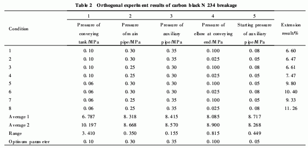 從表2可以看出,影響輸送的主要因素依次為壓送罐壓力、輸送末端的彎管壓力、輔管開啟壓力、主管壓力和輔管壓力。由于賽輪公司須根據(jù)生產(chǎn)的需要來決定每天炭黑的輸送量,因此本試驗至2006年4月底只對炭黑N 234做完了一輪正交試驗,而對其他炭黑還沒有完成正交試驗表所列出的8次試驗,因此對于本試驗的結(jié)果還有待后續(xù)試驗來補充完善,并通過大量的統(tǒng)計分析做出結(jié)論。從經(jīng)驗的角度推斷,壓送罐的壓力越大,出料蝶閥開啟后輸送管道中的料氣混合比越大,阻力越大,所以在輸送的前半程物料的運動速度較低,粒子破碎率也低;至輸送后半程時,由于輸送管道中部分物料進入日罐,管道中物料減少,阻力降低,進氣量特別是輔管進氣量增大,導致管道中的氣速增大,粒子破碎率增加。此時如果給定較高的彎頭結(jié)束輸送壓力和輔管開啟壓力,則可以有效地降低炭黑粒子的破碎率。