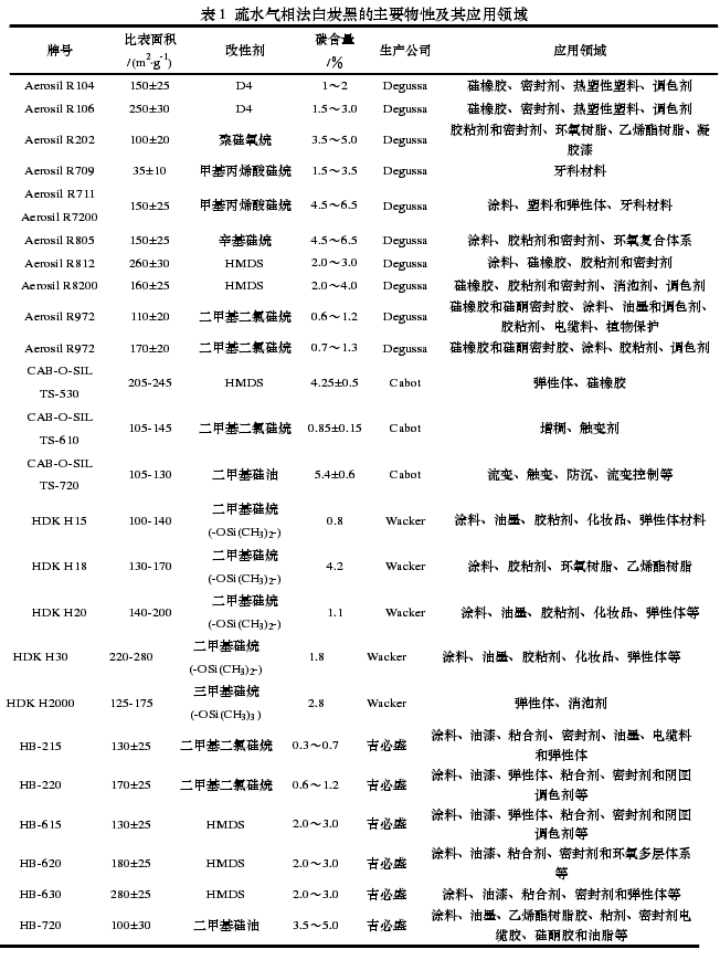 氣相法白炭黑經(jīng)過(guò)表面處理后,大大拓寬了其應(yīng)用領(lǐng)域,提高了它與有機(jī)物的相容性以及它與有機(jī)物的相互作用力,因而可以大大提高材料的性能。而且還可以根據(jù)應(yīng)用需要,選擇合適的表面處理劑對(duì)氣相法白炭黑進(jìn)行表面處理,因而增強(qiáng)了氣相法白炭黑的功能性、可設(shè)計(jì)性。表1給出了一些疏水氣相法白炭黑主要物性及其應(yīng)用領(lǐng)域。