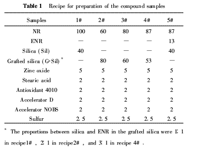采用雙輥開煉機(jī)混煉膠料,配方如表1.前后輥的轉(zhuǎn)速比為1∶1·4,將NR(5#配方中還有ENR)包輥后,加入除促進(jìn)劑和硫磺的其它輔料,再加入40份當(dāng)量的白炭黑,翻煉數(shù)次,最后添加硫磺和促進(jìn)劑,混煉均勻,薄通數(shù)次后出片,制得混煉膠.混煉膠在150℃下按橡膠硫化儀測(cè)得t90的時(shí)間進(jìn)行硫化,制得復(fù)合材料樣品.