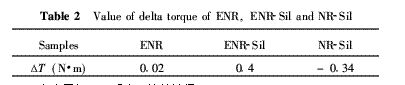 各體系扭矩差值列于表2.可以推斷,在此條件下白炭黑和ENR之間應(yīng)該是發(fā)生了接枝反應(yīng),由此形成了交聯(lián)點(diǎn),引起扭矩上升.因此,白炭黑接枝的起始溫度設(shè)定在170℃.