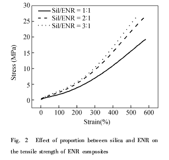在確定白炭黑與ENR的反應(yīng)配比時(shí),主要考慮能否達(dá)到改性白炭黑的目的,即是否能更有效地改善白炭黑的增強(qiáng)性能.填料的增強(qiáng)性能通常以材料應(yīng)力-應(yīng)變曲線上的300%定伸強(qiáng)度來(lái)衡量,所以該研究主要是通過(guò)考察接枝白炭黑的增強(qiáng)性能來(lái)確定合適的改性配比.圖2是不同配比改性的白炭黑填充NR硫化膠的應(yīng)力-應(yīng)變曲線,從圖上可以明顯看出,并不是ENR相對(duì)含量越多對(duì)增強(qiáng)越有利,二者以1∶1的比例反應(yīng)時(shí),其增強(qiáng)效果反而較差,這可能與白炭黑粒子表面ENR包裹層太厚有關(guān),還有ENR經(jīng)高溫高剪切作用分子鏈變短,小分子量的ENR相對(duì)含量較多,主體天然膠的相對(duì)含量較少,這些因素都可能引起材料的強(qiáng)度降低當(dāng)反應(yīng)比例為2∶1時(shí),300%定伸強(qiáng)度相對(duì)1:1時(shí)有很明顯的改善,白炭黑的比例增為3∶1時(shí),增強(qiáng)性能雖然還有進(jìn)一步的提高,但提高的幅度就不是特別明顯了.由此可以判斷,3∶1的比例應(yīng)該是比較接近最佳的反應(yīng)配比條件了,因此后面的接枝表征和性能研究就使用該反應(yīng)配比制得的接枝白炭黑.