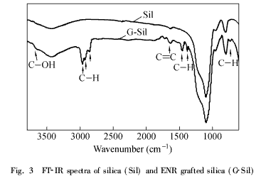 為了表征白炭黑經(jīng)過(guò)ENR接枝改性后表面化學(xué)結(jié)構(gòu)的變化,分別對(duì)接枝前后的白炭黑進(jìn)行了紅外光譜分析.圖3是ENR接枝白炭黑與未接枝白炭黑的紅外光譜圖.