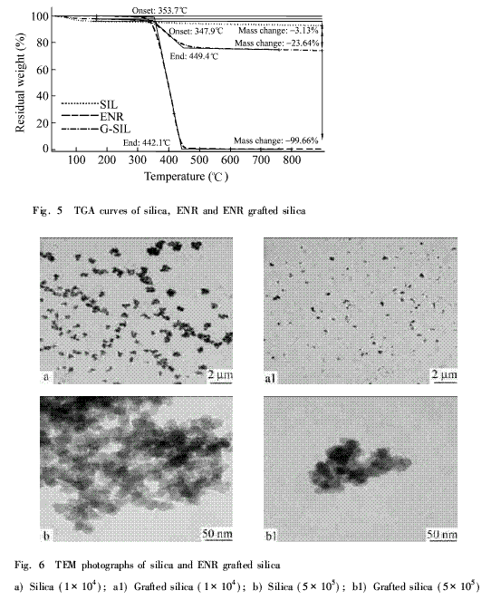 為了進(jìn)一步考察該方法ENR接枝率的大小以及接枝白炭黑的熱穩(wěn)定性,進(jìn)行了TGA分析.圖5分別是白炭黑,ENR和接枝白炭黑的TGA曲線,白炭黑的失重大體分為兩步,150℃之前是脫除吸附水,150℃之后開始脫除結(jié)合水;ENR的失重區(qū)域在353·7~442·1℃;接枝白炭黑除了包含白炭黑的兩階段失重外,在347·9~449·4℃的溫區(qū)出現(xiàn)一個(gè)明顯的失重臺(tái)階,是對(duì)應(yīng)于接枝的ENR的失重.這一臺(tái)階的失重為23·64%,在這一階段中因白炭黑自身脫水的失重量計(jì)算理論值約為2·34%,所以實(shí)際接枝的ENR含量為21·3%.這一方法的接枝率是比較高的,主要是因?yàn)榘滋亢诹W颖砻娓缓罅康牧u基,同時(shí)ENR主鏈上也含有大量的環(huán)氧基團(tuán),兩種基團(tuán)接觸的幾率非常大,只要ENR長(zhǎng)鏈上有一個(gè)環(huán)氧基團(tuán)參與反應(yīng),整條ENR分子就可成功接枝到白炭黑粒子上.此外,從該圖上也反映出,ENR接枝后,熱降解起始溫度有所降低,這可能是因?yàn)榄h(huán)氧環(huán)被打開后,影響了分子鏈的熱穩(wěn)定性;但其失重的終止溫度更高,說(shuō)明了熱穩(wěn)定性更高的界面層的存在.