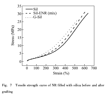 圖7是不同白炭黑增強(qiáng)體系的NR硫化膠的應(yīng)力-應(yīng)變曲線.3個(gè)體系分別是,未改性白炭黑,ENR接枝改性白炭黑和ENR共混改性白炭黑.從圖中可以看出,ENR接枝改性白炭黑的100%和300%定伸應(yīng)力比未改性白炭黑和ENR共混改性白炭黑要高.單純利用ENR共混改性白炭黑雖也能有效提高定伸應(yīng)力,但這主要是由于環(huán)氧基與硅羥基之間能形成氫鍵,與ENR接枝改性白炭黑中ENR與白炭黑通過(guò)共價(jià)鍵結(jié)合不同,所以定伸應(yīng)力低于后者.300%與100%“定伸應(yīng)力比”通常定義為填料的增強(qiáng)性能指數(shù),從拉伸曲線上可以直觀地反映出,三個(gè)體系中接枝白炭黑具有最高的增強(qiáng)性能.ENR接枝白炭黑能明顯改善白炭黑的增強(qiáng)效果,主要源于接枝后不僅改善了白炭黑在NR中的分散,而且白炭黑表面有機(jī)化接枝后,增強(qiáng)了白炭黑與NR基體之間的界面結(jié)合力.曲線上也反映出ENR接枝改性白炭黑體系的拉伸強(qiáng)度和伸長(zhǎng)率略有降低,可能的原因主要是交聯(lián)密度過(guò)大導(dǎo)致的.