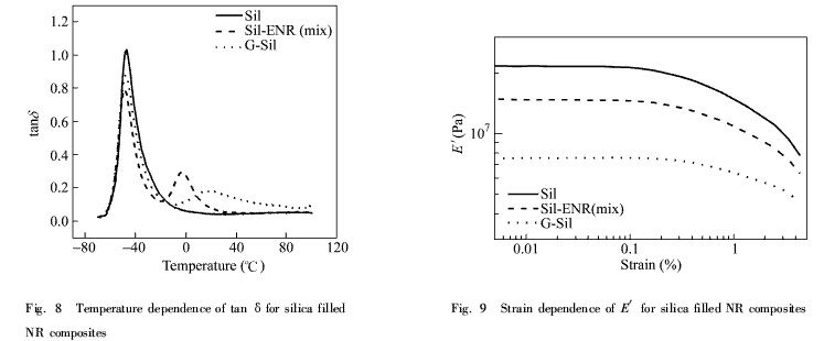 圖8是接枝改性白炭黑、未改性白炭黑和ENR共混改性白炭黑填充NR硫化膠的動(dòng)態(tài)性能對(duì)比.3個(gè)體系中NR的tanδ峰值所處的溫度保持不變,幾乎不受填充體系變化的影響.共混改性體系在-3℃出現(xiàn)一個(gè)tanδ峰值,這應(yīng)該是ENR的玻璃化轉(zhuǎn)變峰,與文獻(xiàn)報(bào)道一致.從共混改性與未改性白炭黑兩條曲線的對(duì)比來(lái)看,共混改性白炭黑明顯提高了0℃附近的tanδ,而對(duì)室溫以上的tanδ值影響不大;在Haake內(nèi)接枝改性后,處于-3℃的ENR玻璃化轉(zhuǎn)變峰值向高溫方向偏移20℃左右,并且峰型變寬.這可能是ENR接枝到白炭黑表面上后,大部分的ENR分子鏈?zhǔn)艿绞`從而變得更剛性,運(yùn)動(dòng)更困難造成的.ENR玻璃化轉(zhuǎn)變向高溫偏移,使得該復(fù)合材料在室溫下的tanδ值明顯增大,這一動(dòng)態(tài)特點(diǎn)可以滿足賽車等輪胎強(qiáng)的摩擦力和抓著力要求以及賦予高強(qiáng)度減震材料良好的阻尼性能.在進(jìn)一步的研究中通過(guò)選用不同環(huán)氧度的ENR接枝白炭黑,可以在較寬的溫域內(nèi)對(duì)材料的tanδ值進(jìn)行有效調(diào)控,以獲得所期望的最佳性能的材料.