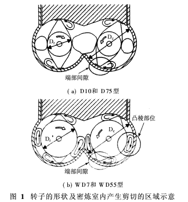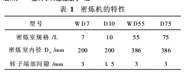 四種密煉機轉(zhuǎn)子的外徑和轉(zhuǎn)子凸棱前端間隙的尺寸列于表1。WD55型和D75型各部分的數(shù)據(jù)相同。D10型的數(shù)值是WD55型和D75型的1/2左右。但是,WD7型的端部間隙是D10型的2倍。在密煉機轉(zhuǎn)子轉(zhuǎn)速相同的情況下,D10型、WD55型和D75型間隙部位的剪切速率也是相同的,WD7型間隙部位的剪切速率約是其1/2。若用等剪切速率對WD7型轉(zhuǎn)子和室壁間隙部位的剪切速率進行比較的話,則WD7型轉(zhuǎn)子轉(zhuǎn)速提高了1倍。