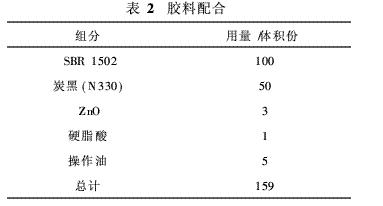 試驗所用的橡膠是住友公司出品的乳聚SBR1502;填料(炭黑)是三菱化學(xué)的HAFN330;氧化鋅(ZnO)是東邦亞鉛公司的銀嶺A;硬脂酸和硫黃的配合比例見表2所示。