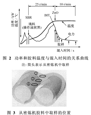 把上述材料加入混煉室,填充率為0. 75。圖2為試驗中功率值、膠料溫度和混煉時間之間關(guān)系的模擬圖。SBR和硬脂酸投入后混煉2min(轉(zhuǎn)速25 r/min),然后,將炭黑和硫黃投入,混煉至過了BIT(炭黑混入時間)后,再投入ZnO,此時轉(zhuǎn)速控制在10 r/min。當(dāng)轉(zhuǎn)子的轉(zhuǎn)動數(shù)達600轉(zhuǎn)時,進行取樣。為了抑制膠料生熱,取樣時轉(zhuǎn)子的速度要控制在10 r/min以下。在炭黑分散過程中,大的剪切力至關(guān)重要。膠料溫度攀升,粘度下降,剪切應(yīng)力就減小。試驗用的密煉機的冷卻能力存在著差異,所以,膠料溫度攀升中出現(xiàn)的差異可以進行預(yù)測。為稍許平衡各密煉機中膠料溫度的差異,應(yīng)降低轉(zhuǎn)子的轉(zhuǎn)速。