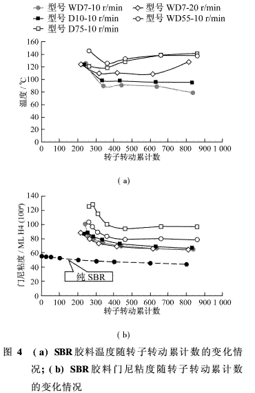 圖4列示了取樣時膠料溫度和累計轉(zhuǎn)動數(shù)的相關(guān)曲線。橫軸數(shù)值表示炭黑加入后轉(zhuǎn)子轉(zhuǎn)動的累計數(shù)。該累計轉(zhuǎn)動數(shù)是以25 r/min轉(zhuǎn)速混煉時,剛過BIT(炭黑混入時間)以及過了BIT后的250轉(zhuǎn),轉(zhuǎn)速為10 r/min時20、50、100、200、400、600轉(zhuǎn)合計起來的數(shù)值。在混煉室的大小和轉(zhuǎn)子端部間隙剪切速率相同的WD55型和D75型密煉機中,膠料的溫度無差異。但是,對于混煉室小的WD7型和D10型密煉機來說,無論轉(zhuǎn)數(shù)多少,其膠料溫度都比WD55型和D75型的低。WD7型和D1型裝置小,發(fā)熱量低,單位容積中導(dǎo)熱面積大,降溫效果明顯。