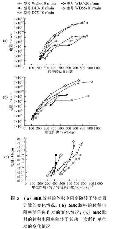 WD7型密煉機的轉(zhuǎn)速為10 r/min時,單位功率值是1. 1 kWh/kg,體積電阻率為1×109Ωcm。與此相比,WD型轉(zhuǎn)子與密煉機中室壁之間的剪切速率相對較小;在這種場合,要使體積電阻率保持同等水平,就需要更多的混煉能量。