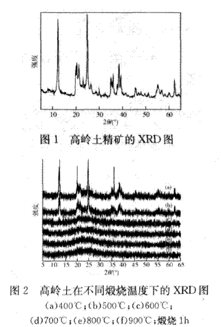 圖1和圖2分別是高嶺土精礦在煅燒前后的X射線(xiàn)衍射圖譜。從圖1的XRD譜圖上,可以看到典型的高嶺土結(jié)構(gòu)的衍射峰,特征值為:d001=7·13,d110=4·35,d111=4·16等。由圖2可見(jiàn),當(dāng)煅燒溫度為400℃時(shí),這些強(qiáng)峰依然存在,且變化不大,說(shuō)明煅燒溫度為400℃時(shí),高嶺土沒(méi)有被活化。當(dāng)煅燒溫度為500℃時(shí),高嶺土的特征峰強(qiáng)度明顯減弱,說(shuō)明高嶺土的骨架結(jié)構(gòu)開(kāi)始遭到破壞。當(dāng)溫度達(dá)到600℃時(shí),衍射峰基本消失,說(shuō)明高嶺土已轉(zhuǎn)變?yōu)榉蔷B(tài)的偏高嶺石,當(dāng)溫度為700℃、800℃和900℃時(shí),高嶺土保持非晶結(jié)構(gòu)不變。