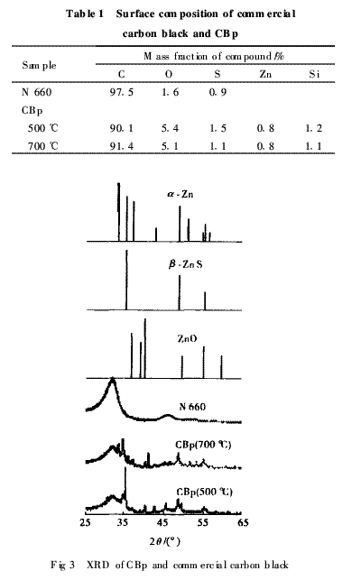 從圖3中可以看出,熱解炭黑與工業(yè)炭黑N 660有相似的主體結(jié)構(gòu),但熱解炭黑表面沉積了少量的無機(jī)物。經(jīng)XRD分析表明,在熱解炭黑表面主要沉積的無機(jī)物為α-ZnS,β-ZnS,ZnO,不同溫度條件下熱解炭黑表面沉積的量不同,500℃下熱解炭黑比700℃下熱解炭黑含有較多的ZnO,而ZnS較少。