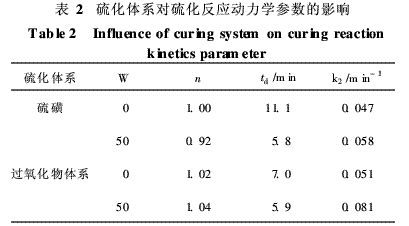 (3)在硫磺和過氧化物這兩種硫化體系中,非炭黑填料對(duì)k2的相互作用相差不大, DCP體系的k2大于硫磺體系的k2,td長于硫磺體系的。