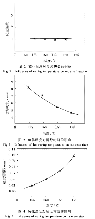 在化學(xué)反應(yīng)動(dòng)力學(xué)中,溫度是一個(gè)很重要的影響因素,圖2~圖4是溫度對(duì)碳酸鈣填充膠料影響的考察結(jié)果。各動(dòng)力學(xué)參數(shù)是在4個(gè)溫度下測取的。