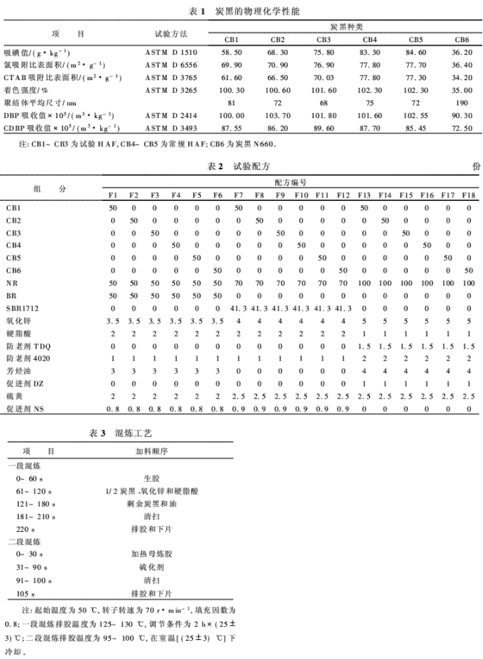 下列是炭黑和膠料物化測試和膠料鑒定使用的主要設(shè)備:布拉本德E型吸油計,德國布拉本德公司產(chǎn)品;氮吸附比表面積測試儀,美國Quanta-chrome公司產(chǎn)品;Bi-DCP型聚結(jié)體尺寸測試儀,美國布魯克黑儀器公司產(chǎn)品;埃里克森著色度試驗機,德國產(chǎn)品; MV2000型門尼粘度計和MDR2000型硫化儀,美國埃邇法科技有限公司產(chǎn)品;Zwick Z010型拉力試驗機和Zwick 5109型回彈值測試儀,德國產(chǎn)品;Ⅱ型固特里奇屈撓計,美國產(chǎn)品;破壞疲勞試驗機,美國孟山都公司產(chǎn)品。