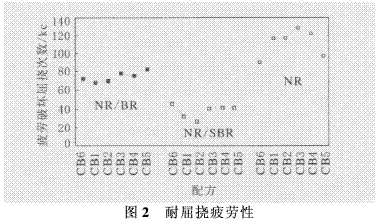 用孟山都疲勞破壞試驗機測量膠料的耐疲勞性能。試驗使用無中心割口試樣,按照孟山都在操作使用手冊中規(guī)定的程序進行。每種膠料測試6個試樣,測試結(jié)果的平均值以千次(kc)報告。所有膠料的試驗結(jié)果示于圖2。從圖2可以看出,在高苛刻度用途中,采用NR配方的試驗炭黑(CB1)耐疲勞性能優(yōu)于普通炭黑N660(CB6)。NR配方試驗炭黑的耐屈撓疲勞性提高了20%。輪胎子午化使胎體膠料發(fā)生了更多采用NR的變化,因為子午線輪胎要求膠料在較高強度下的耐疲勞性能好,由于NR固有的高生膠強度,其還有利于子午線輪胎的成型。