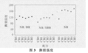 在結(jié)晶橡膠中,撕裂通常以粘-滑方式發(fā)生,力不斷加大,直至達到快速破壞點。撕裂試驗按照ASTM D 624方法采用C型裁刀試樣進行。圖3示出了撕裂強度試驗結(jié)果(原文圖中無單位———譯者注)。從圖2和3可以看出,不同配方的撕裂強度與其疲勞破壞值有良好的相關(guān)性。在所有3種配方的試驗中,試驗炭黑(CB1)的撕裂強度均優(yōu)于炭黑N660(CB6),表明其更適用于輪胎,特別是高苛刻度使用條件輪胎的胎體膠料。