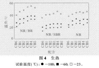 輪胎在行駛過程中的內(nèi)部溫度可達到100℃。帶束層邊緣的溫度可以大大超過100℃。在這種高溫下,不飽和彈性體的老化發(fā)生得相當(dāng)快,而且內(nèi)襯層的氣密性受到影響,使得胎體內(nèi)部壓力進一步升高,這將使胎體膠料遭到雙重打擊。按照ASTM D 623方法使用固特里奇屈撓計測試試樣,試驗在23,60和100℃溫度下進行。但是考慮到實用性,僅限于討論60和100℃下的試驗結(jié)果。在屈撓過程中,胎體膠料反復(fù)變形,當(dāng)變形力消除后,胎體附膠必須是彈性的,能恢復(fù)到未變形時的形狀。此外,膠料必須是彈性的,以使輪胎在使用過程中生熱不會過高。生熱過高會降低膠料強度,引起破壞。