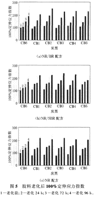 考慮輪胎胎體使用中要經(jīng)受大范圍的苛刻條件和多次翻新,在70℃×24,72或96 h等不同條件下進行了老化試驗。測定100%定伸應(yīng)力、拉伸強度和拉斷伸長率等性能。胎體膠料的老化性能非常重要,因為它決定了在長期使用中輪胎的翻新率和破壞。為了便于了解和對比老化性能,將性能的絕對值轉(zhuǎn)換成了指數(shù),以每個炭黑N660(CB6)配方的老化前性能值為100。