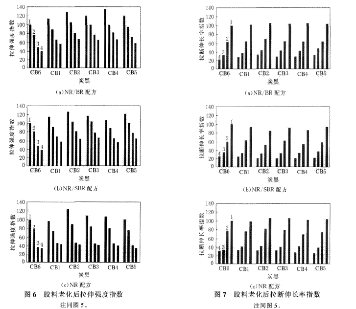 拉伸強度是單軸拉伸下交聯(lián)網(wǎng)絡(luò)的強度。它涉及橡膠鏈的強度以及通過交聯(lián)和填料補強作用增加的強度。橡膠中的交聯(lián)點控制著交聯(lián)鍵。填料的補強作用取決于橡膠-填料的相互作用、浸潤性和表面化學(xué)等。當(dāng)交聯(lián)網(wǎng)絡(luò)受力時,如果拉伸是均勻分布的(如在單硫鍵或以高比表面積炭黑填充的情況下),則拉伸強度提高。在同樣的網(wǎng)絡(luò)中,老化后(在熱影響下)多硫鍵斷裂使拉伸強度下降。圖6示出了3種配方中6種炭黑試樣在老化前或不同老化時間后的拉伸強度指數(shù)。拉伸強度的趨勢類似于定伸應(yīng)力,在所有試驗條件下,NR/SBR和NR試驗配方中試驗炭黑CB1的保持率均優(yōu)于炭黑N660。原因可能是,與普通炭黑N660相比,試驗炭黑CB1的聚結(jié)體直徑較小,而且表面活性較高。
