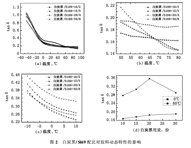 本文利用動態(tài)力學分析技術(shù)(DMA),對偶聯(lián)劑Si69、白炭黑的不同填充量的硫化膠料進行研究,一方面得出tanδ值隨溫度和Si69、白炭黑用量變化的關(guān)系,另一方面研究偶聯(lián)劑Si69、白炭黑用量的改變對橡膠滾動阻力和濕抓著性的影響。