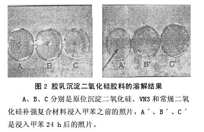 圖2是含有常規(guī)二氧化硅和VN3的樣品在甲苯中完全溶解的現(xiàn)象圖。相對于含有常規(guī)二氧化硅和VN3的樣品能夠完全溶解,含有原位沉淀二氧化硅的樣品在甲苯中形成一個溶脹膠團。這種現(xiàn)象表明,在有原位沉淀二氧化硅的樣品中,填料與聚合物之間的相互作用程度更大。
