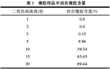 由表2可以看出,隨著原位沉淀二氧化硅含量的增加,結(jié)合橡膠的含量不斷增加,當二氧化硅用量達到20份時,結(jié)合橡膠含量最大。含有此濃度的結(jié)合橡膠樣品,我們認為是母煉膠。