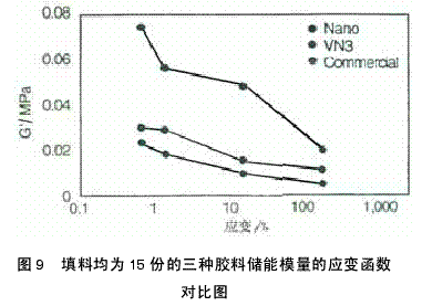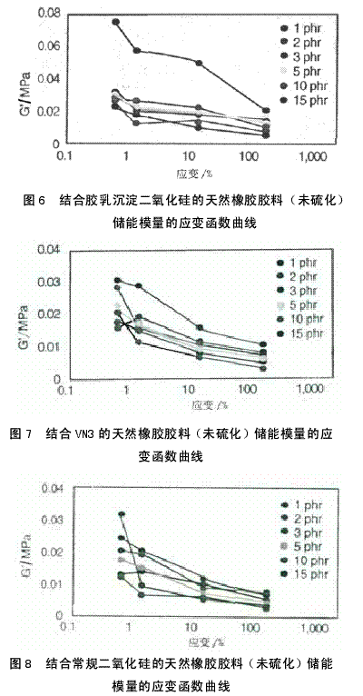圖6顯示的是沉淀二氧化硅補強天然橡膠復(fù)合材料的未硫化樣品的儲能模量隨應(yīng)變掃描的變化。在未硫化的填充膠料中,生膠、流體動力學(xué)效應(yīng)、填料網(wǎng)狀結(jié)構(gòu)和聚合物填料間的相互作用均對Gˊ有影響。Gˊ值的差異除了與生膠和流體動力學(xué)效應(yīng)有關(guān),通過Gˊ值也可以反映出橡膠與填料之間的相互作用。由圖7和圖8可以明顯看出,VN3和常規(guī)二氧化硅補強的復(fù)合材料中橡膠填料間的相互作用力比乳液沉淀二氧化硅中的相互作用力低。所以新路線制得的復(fù)合材料有更高的模量與△G值,并具有更高的承載性能與橡膠填料間的相互作用力。